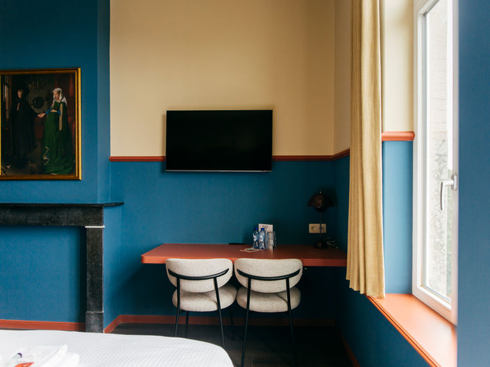 De interieurs brengen een verfijnde mix van oud en nieuw. Originele elementen werden vakkundig gerestaureerd en extra in de verf gezet door het gebruik van kleur. Nieuwe toevoegingen zijn strak, hedendaags en voegen een frisse dynamiek toe aan de historische setting. Opvallend is het gebruik van authentieke schilderijen als behang, waardoor de rijke geschiedenis van Brugge voelbaar aanwezig blijft in elke kamer.